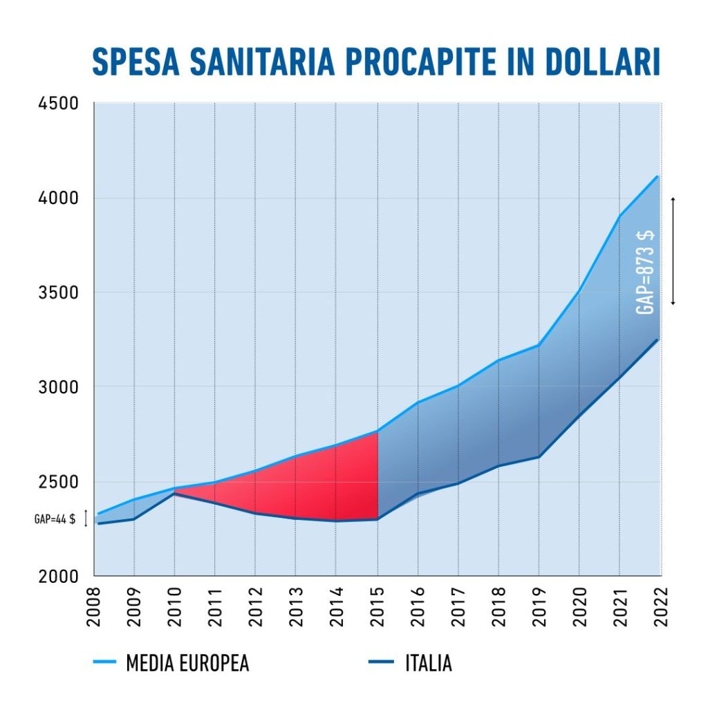 Nel 2022, a parità di potere di acquisto, l’incremento della spesa pro capite in Italia, è stato del 6,7%, inferiore a quello di Germania (+7,9%) e Francia (+8,6%), mentre il Regno Unito ha ridotto la spesa dell’1,3%. Anche considerando il biennio 2020-2021, il più duro per la pandemia da SARS-CoV2, pur facendo registrare una crescita nell’insieme del 15,5%, quindi con un incremento rilevante rispetto a quello medio degli anni precedenti, la spesa sanitaria pubblica italiana è cresciuta comunque meno rispetto che a Francia (+19,2%), Germania (18,4%) e Regno Unito (+28,6%).