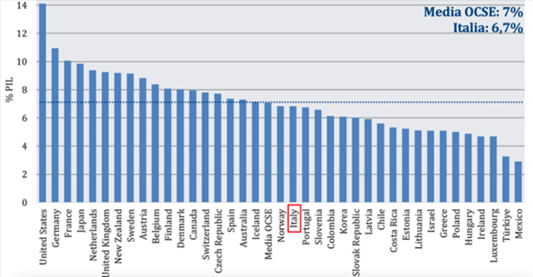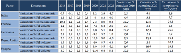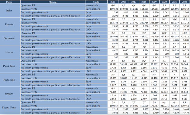 Considerando l’incidenza sul PIL, la spesa sanitaria pubblica italiana è stata nel 2022 pari al 6,8%, superiore a quella del Portogallo (6,7%) e della Grecia (5,1%), ma inferiore di ben 4,1 punti percentuali rispetto a quella tedesca (10,9%), di 3,5 punti rispetto a quella francese (10,3%), di 2,5 punti rispetto al Regno Unito (9,3%), e inferiore di mezzo punto anche rispetto a quella spagnola (7,3%).