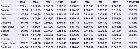 La tabella successiva illustra l’evoluzione della spesa sanitaria pubblica pro capite in alcuni Paesi dell’OCSE, a parità di potere di acquisto, dal 1990 al 2022.