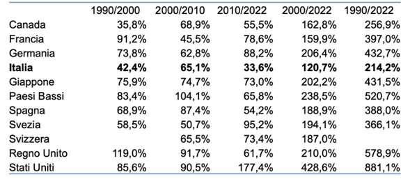 Tab. 3 – Incrementi percentuali della spesa sanitaria pubblica pro capite in un gruppo di Paesi OCSE. 1990-2022