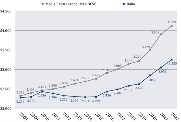 Il grafico successivo illustra il trend della evoluzione della spesa pubblica pro capite tra il 2008 e il 2022 nei Paesi OCSE.