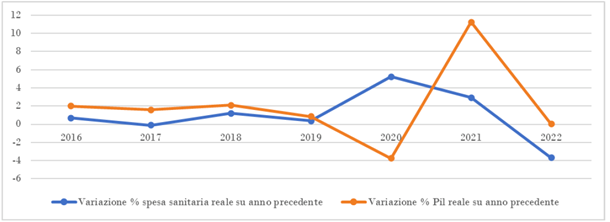 Il grafico successivo evidenzia l’andamento della crescita percentuale della spesa sanitaria e del PIL italiani rispetto all’anno precedente nel periodo 2016-2022.