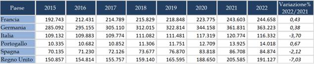 La tabella successiva rende conto della evoluzione dei principali indicatori macroeconomici OCSE riguardanti la spesa sanitaria pubblica per alcuni Paesi europei nel periodo 2015-2022.