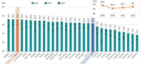 Questi dati, nell’insieme, ci hanno fatto parlare già in passato del SSN come di un sistema sanitario pubblico frugale, in grado di raggiungere risultati particolarmente significativi a costi estremamente contenuti. Il confronto internazionale documenta una spesa sanitaria pro capite in Italia più bassa della media UE di quasi un terzo, ma anche uno stato di salute della popolazione buono, e una aspettativa di vita tra le più elevate. Dai 79,9 anni del 2000 la speranza di vita alla nascita è salita agli 83,6 del 2019, più alta di Germania, Francia, Regno Unito, Svezia e seconda in Europa solo alla Spagna con 83,9 anni. Dopo aver perso 1,3 anni nel 2020, con la pandemia da SARS-CoV2, l’aspettativa di vita italiana ha registrato un recupero nel 2022, tornando a 83 anni, uno dei livelli più elevati in Europa, superiore di 2,3 anni alla media UE, sebbene ancora inferiore al dato pre-pandemico.