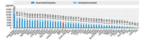 Fonte: OECD Health Statistics 2023; WHO Global Health Expenditure Database