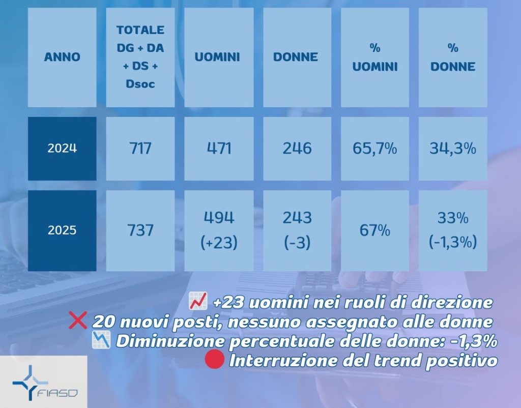 Per la prima volta dal 2018 si interrompe la crescita della presenza femminile nelle direzioni delle aziende sanitarie italiane. Lo dicono i dati aggiornati dalla Federazione italiana aziende sanitarie e ospedaliere (Fiaso). In termini percentuali assoluti, infatti, le donne ricoprono oggi un terzo del totale degli incarichi di vertice, ma dal 2024 sono passate dal 34,3% al 33% (pari a -1,3%), segnando un’inversione di tendenza rispetto alla crescita costante registrata negli ultimi anni. Una flessione evidenziata anche in rapporto all’aumento complessivo delle posizioni di vertice nelle aziende sanitarie italiane. Gli incarichi totali sono, infatti, passati da 717 a 737 (+20 posizioni), ma mentre il numero di uomini ai vertici è aumentato, passando da 471 a 494 (+23 posti), quello delle donne è sceso da 246 a 243 (-3 posti).