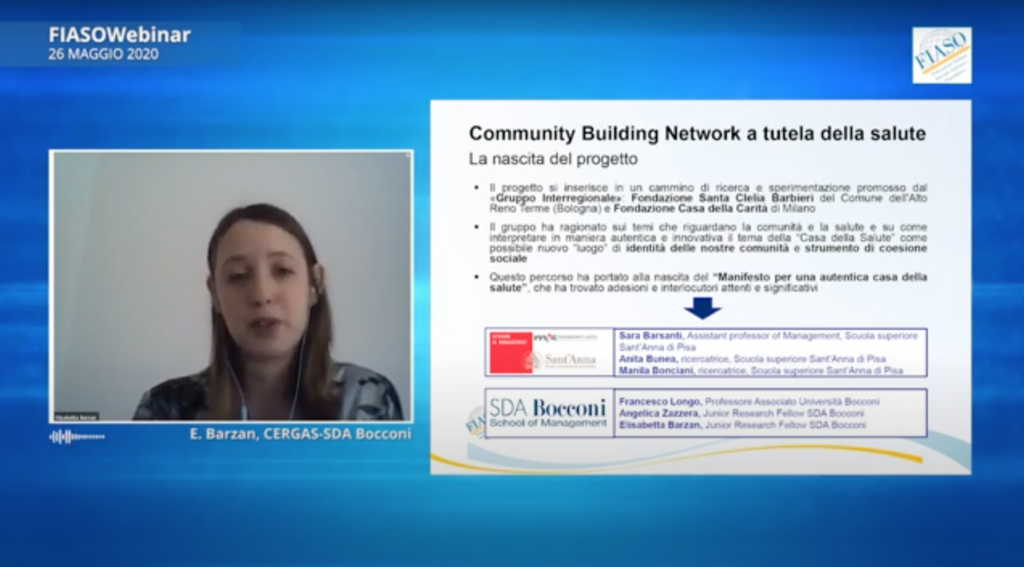 Il webinar, che si è svolto martedì 26 maggio, dalle 12,00 alle 13,30, è dedicato al Community Building per sostenere la gestione del COVID. Elisabetta Barzan, docente di Economia e Management del CERGAS-SDA Bocconi, ci guida tra le definizioni e concezioni di community bulding e di engagement, F. Longo, professore di Analisi delle Politiche e Management pubblico della Università Bocconi, ne analizza l’attualità, S. Barsanti, ricercatrice del S. Anna di Pisa, illustra la matrice finalità/programmi, A. Zazzera e A. Bunea, ricercatrici rispettivamente del CERGAS-SDA Bocconi e del S. Anna di Pisa, ci presentano una serie di esempi. La testimonianza è affidata a S. Rao della Bottega del possibile, le conclusioni a F. Longo.