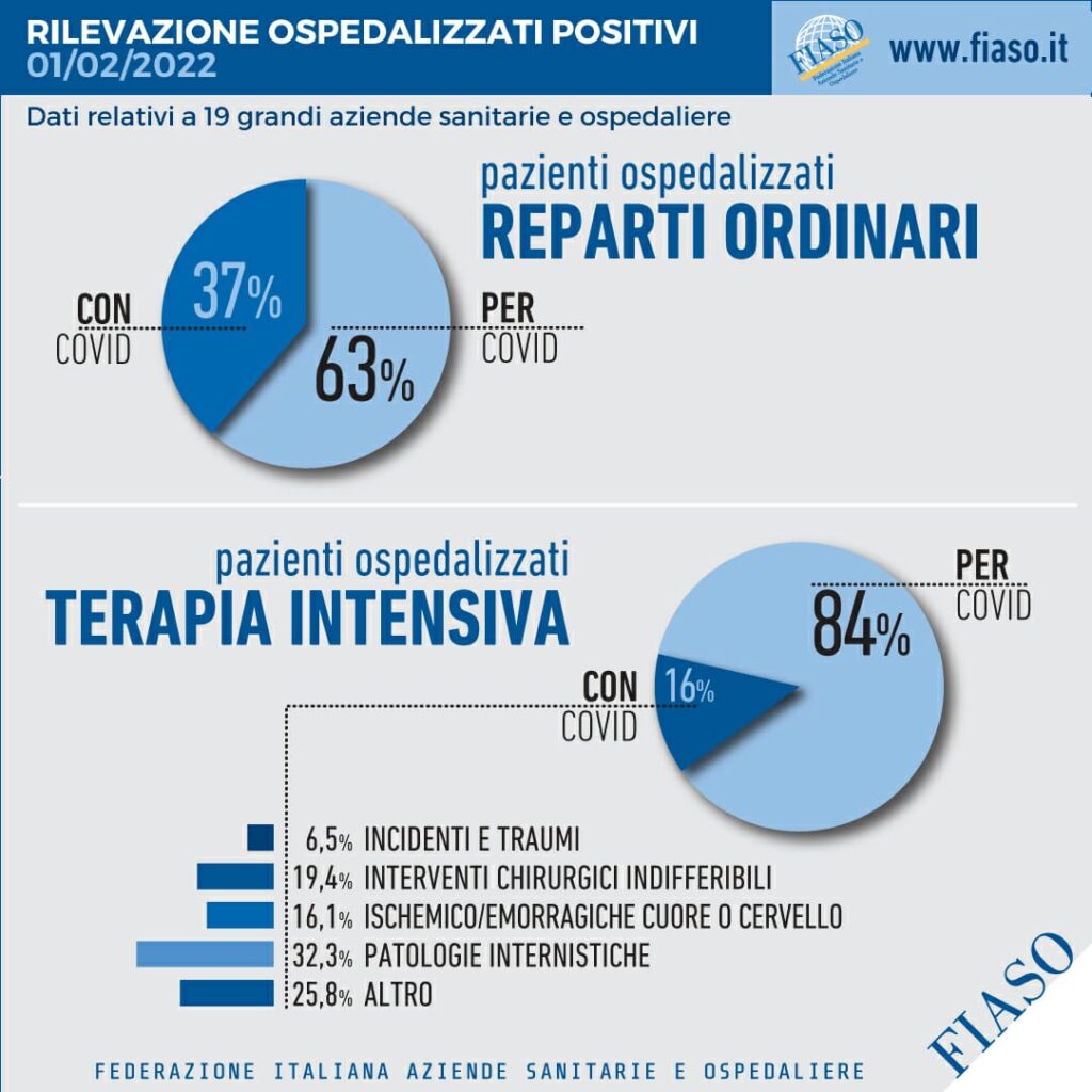 All’interno delle aree adibite a degenze Covid, sia i reparti ordinari sia le terapie intensive, è possibile fare una distinzione tra ricoverati “Per Covid e “Con Covid”. La rilevazione è stata effettuata il 1 febbraio attraverso la rete degli ospedali sentinella Fiaso.