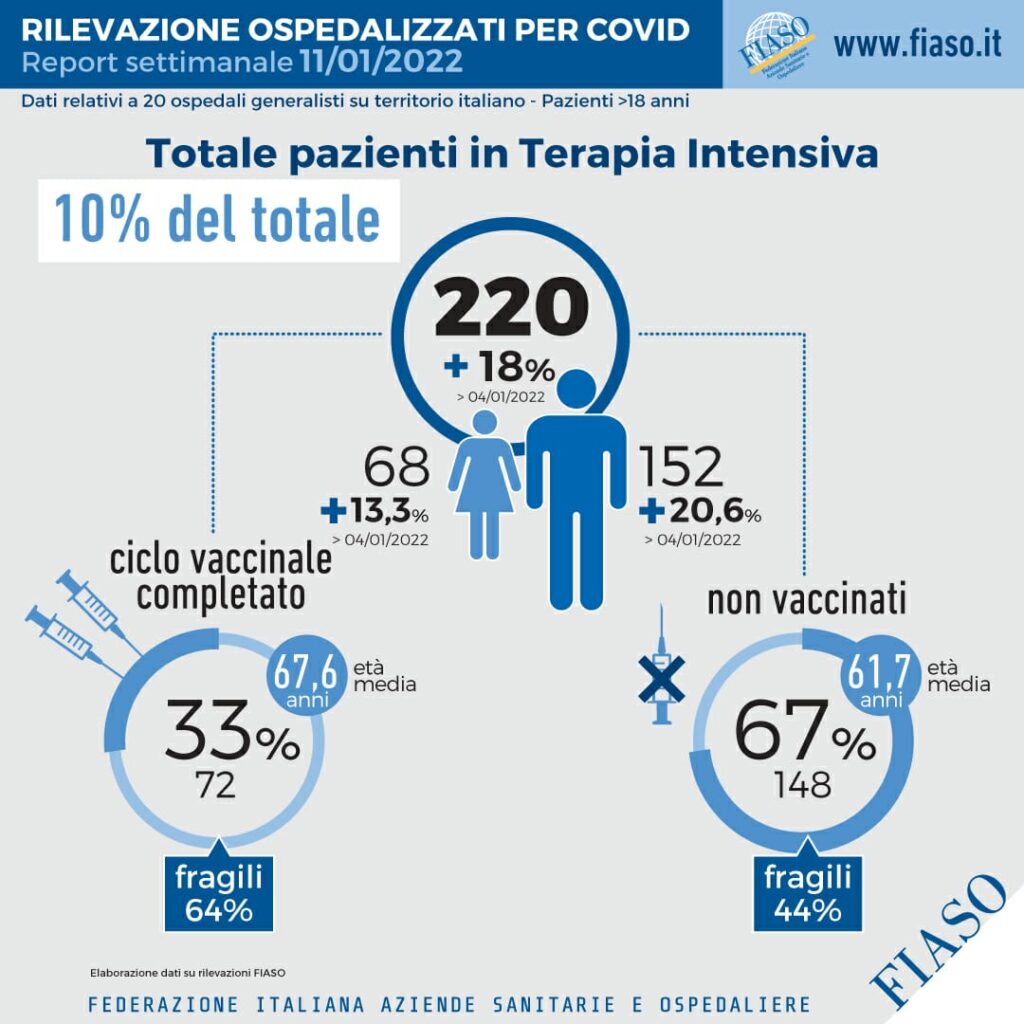 In una settimana la crescita nelle terapie intensive negli ospedali sentinella Fiaso è stata del 18%. La proporzione tra pazienti vax e no vax rimane stabile: i non vaccinati ricoverati in rianimazione sono il 67% del totale. La metà di no vax, il 54%, prima di finire in ospedale, godeva di buona salute e non aveva comorbidità.