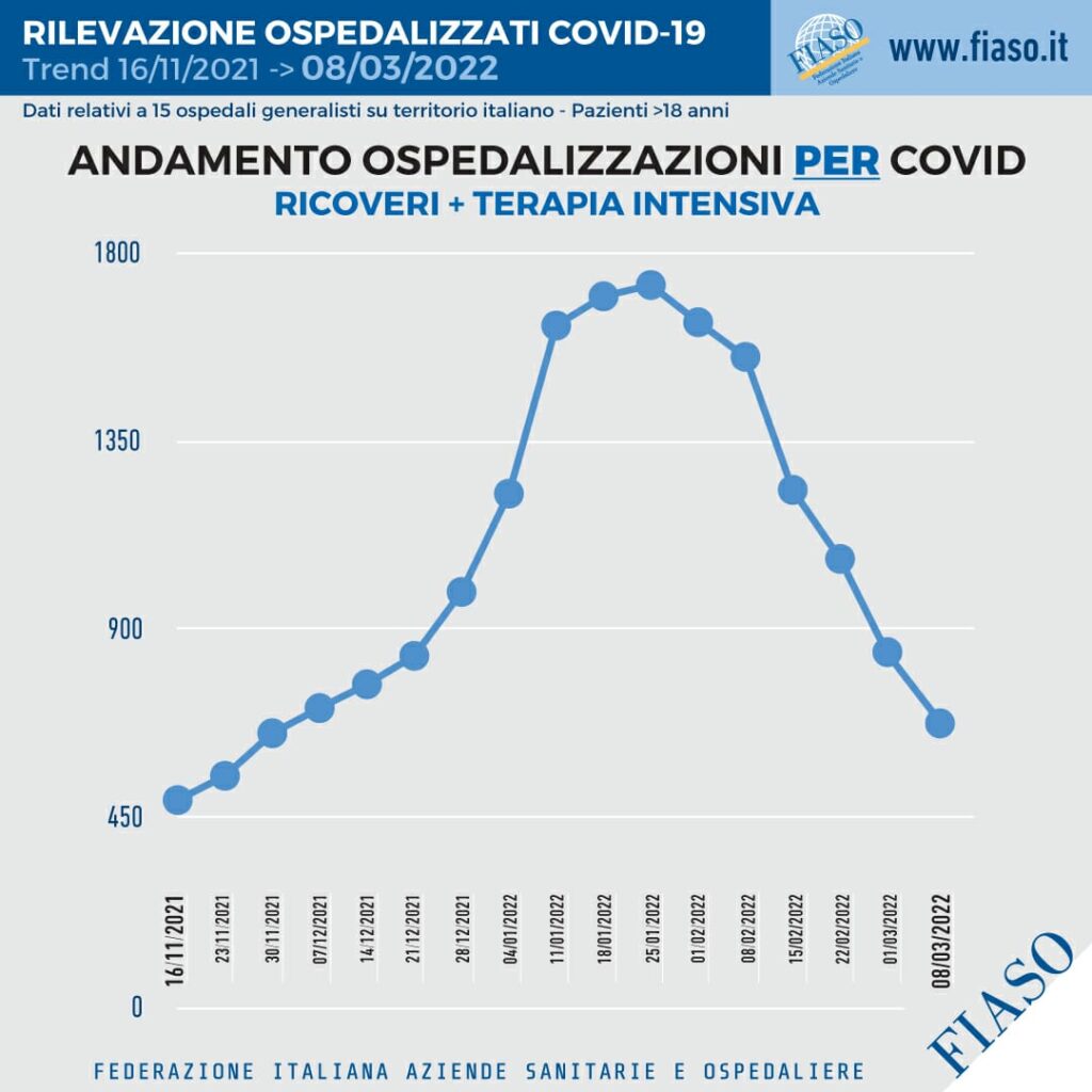 I ricoveri Covid scendono ancora del 16,2% in una settimana: è il dato che emerge dalla rilevazione negli ospedali sentinella Fiaso dell’8 marzo. La curva delle ospedalizzazioni, che ha cominciato a flettere dal 1° febbraio, aveva fatto registrato il 1° marzo il calo più netto della quarta ondata pari al 21,6%.