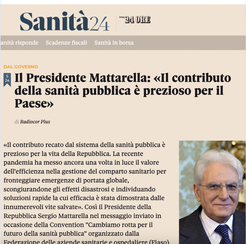 «Il contributo recato dal sistema della sanità pubblica è prezioso per la vita della Repubblica. La recente pandemia ha messo ancora una volta in luce il valore dell’efficienza nella gestione del comparto sanitario per fronteggiare emergenze di portata globale, scongiurandone gli effetti disastrosi e individuando soluzioni rapide la cui efficacia è stata dimostrata dalle innumerevoli vite salvate». Così il Presidente della Repubblica Sergio Mattarella nel messaggio inviato in occasione della Convention “Cambiamo rotta per il futuro della sanità pubblica” organizzato dalla Federazione delle aziende sanitarie e ospedaliere (Fiaso), che si è aperta a Roma.