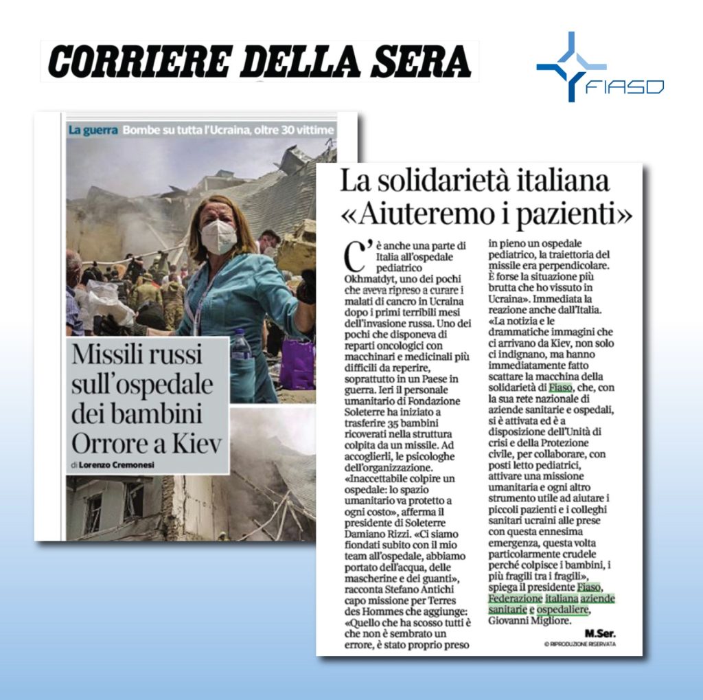 “La notizia e le drammatiche immagini che ci arrivano dall’ospedale pediatrico Okhmatdy di Kiev, pesantemente bombardato da missili russi, non solo ci indignano, ma hanno immediatamente fatto scattare la macchina della solidarietà di Fiaso, che, con la sua rete nazionale di aziende sanitarie e ospedali, si è attivata ed è a disposizione dell’Unità di crisi e della Protezione civile, per collaborare, con posti letto pediatrici, attivare una missione umanitaria e ogni altro strumento utile ad aiutare i piccoli pazienti e i colleghi sanitari ucraini alle prese con questa ennesima emergenza, questa volta particolarmente crudele perché colpisce i bambini, i più fragili tra i fragili”. Lo dichiara in una nota il presidente Fiaso, Federazione italiana aziende sanitarie e ospedaliere, Giovanni Migliore.