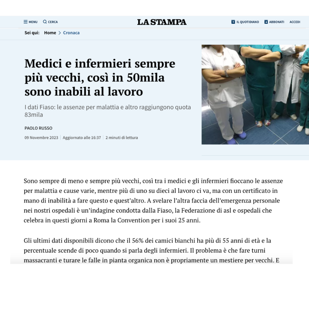 Sono sempre di meno e sempre più vecchi, così tra i medici e gli infermieri fioccano le assenze per malattia e cause varie, mentre più di uno su dieci al lavoro ci va, ma con un certificato in mano di inabilità a fare questo e quest’altro. A svelare l’altra faccia dell’emergenza personale nei nostri ospedali è un’indagine condotta dalla Fiaso, la Federazione di asl e ospedali che celebra in questi giorni a Roma la Convention per i suoi 25 anni.