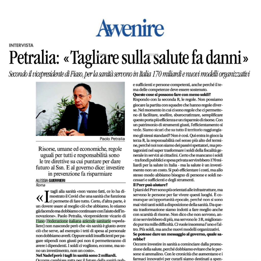 Secondo il vicepresidente di Fiaso, per la sanità servono in Italia 170 miliardi e nuovi modelli organizzativi